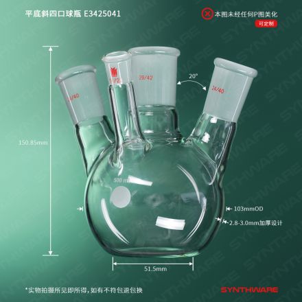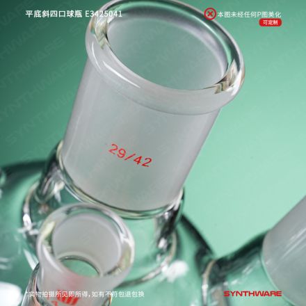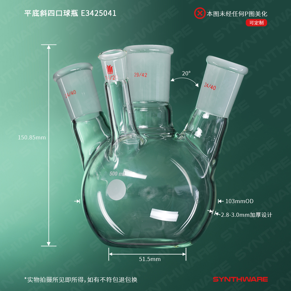 平底斜四口球瓶,中间口:29/42,侧磨口:24/40,前口:24/40,500ml E342500