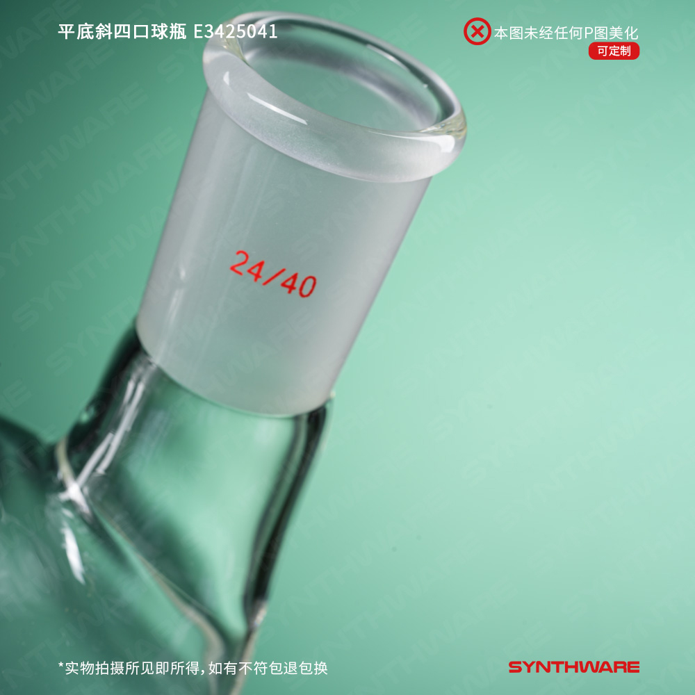 平底斜四口球瓶,中间口:24/40,侧磨口:14/20,前口:14/20,100ml E344100