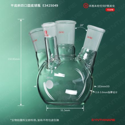 平底斜四口圆底球瓶,中间口:29/42,侧磨口:24/40,前口:24/40,500ml E342500