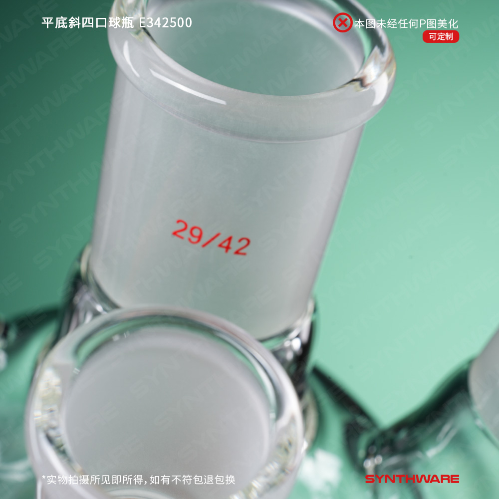 平底斜四口球瓶,中间口:14/20,侧磨口:14/20,前口:14/20,100ml E341100