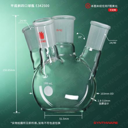 平底斜四口球瓶,中间口:34/45,侧磨口:24/40,前口:24/40,500ml E343500