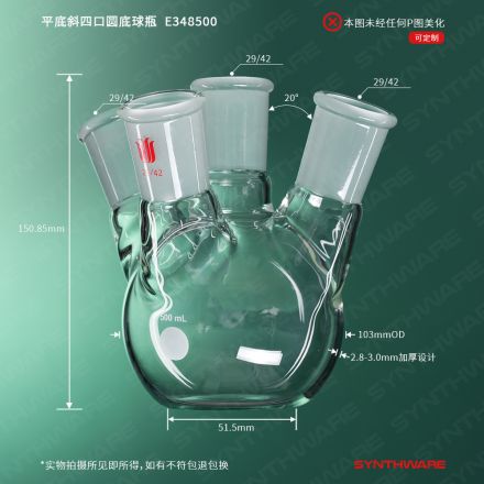 平底斜四口圆底球瓶,中间口:29/42,侧磨口:24/40,前口:24/40,500ml E342500