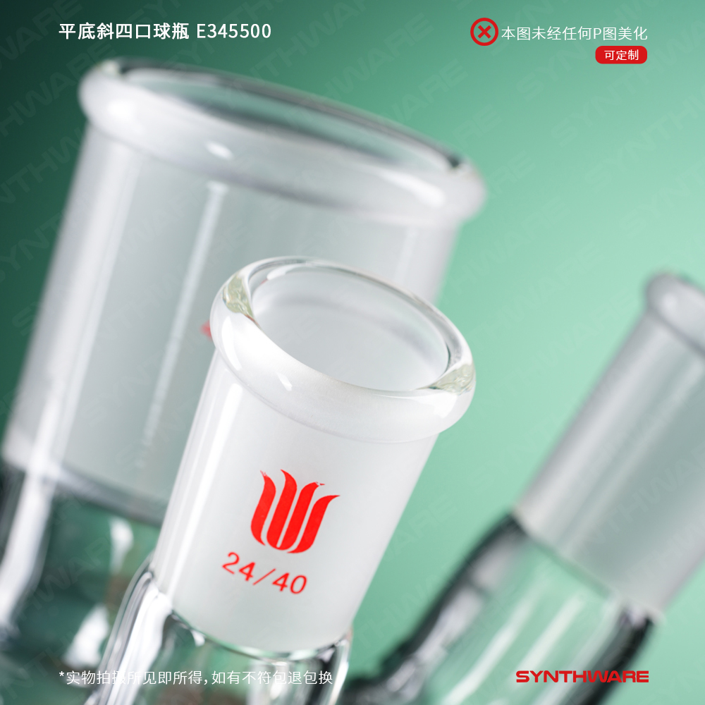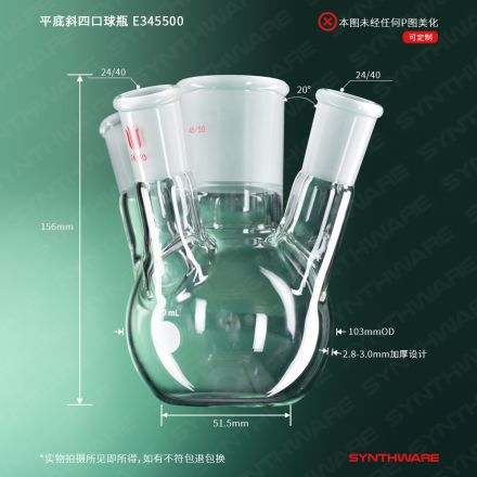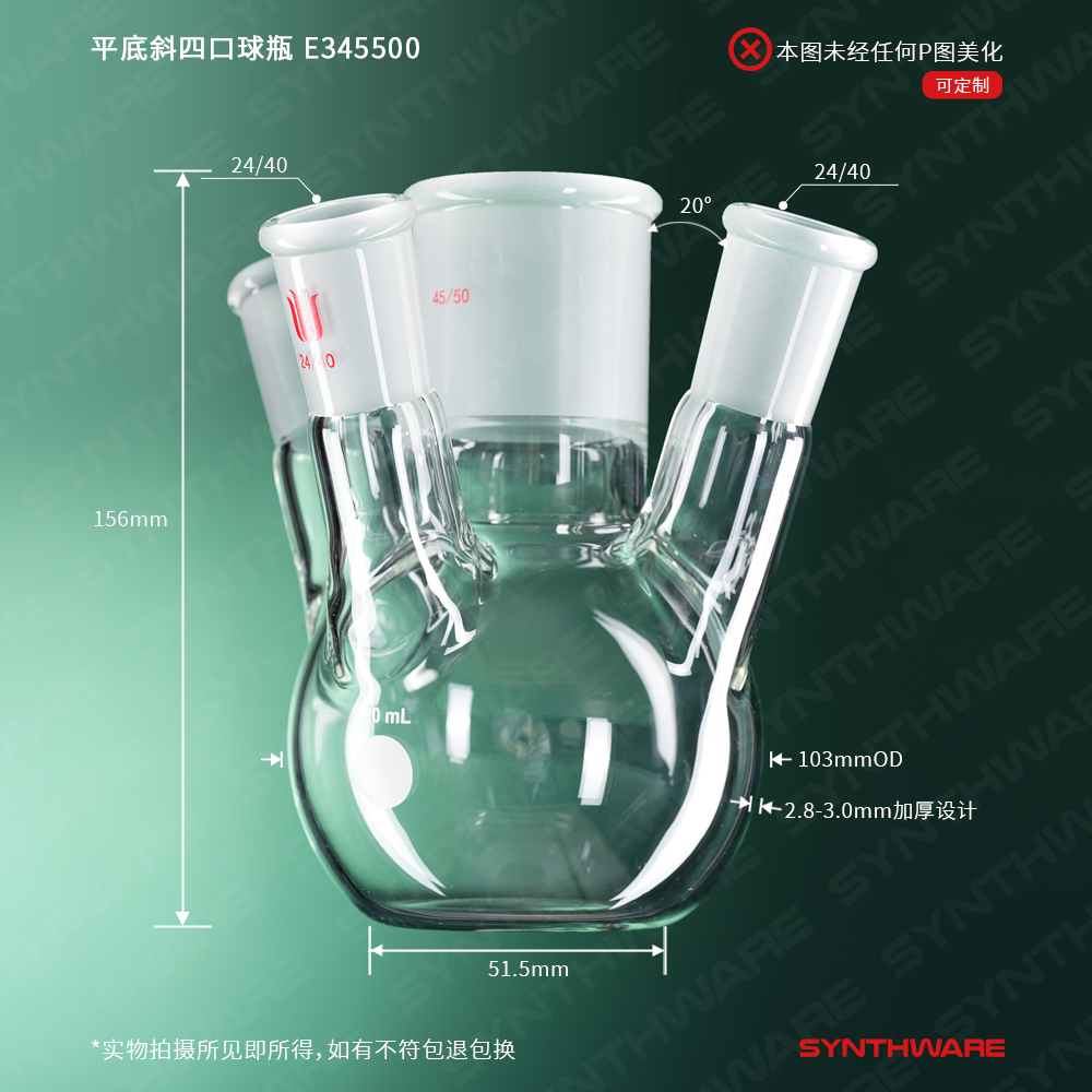 平底斜四口球瓶,中间口:34/45,侧磨口:24/40,前口:24/40,500ml E343500