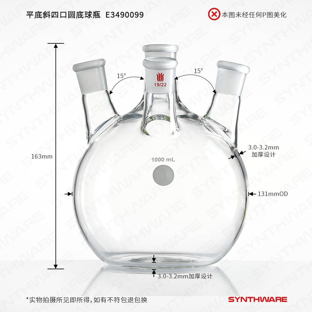 平底斜四口球瓶,中磨口:29/42,侧口:24/40,前口:19/22,1000ml E3480049