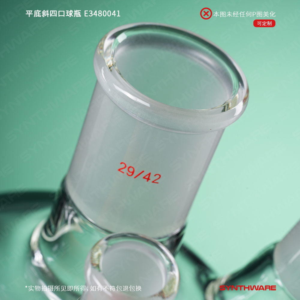 平底斜四口球瓶,中间口:29/42,侧磨口:24/40,前口:24/40,500ml E342500