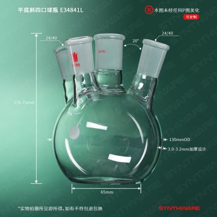 平底斜三口球瓶,厚壁高强度,中间磨口:14/20,侧磨口:14/20,100ml E331100