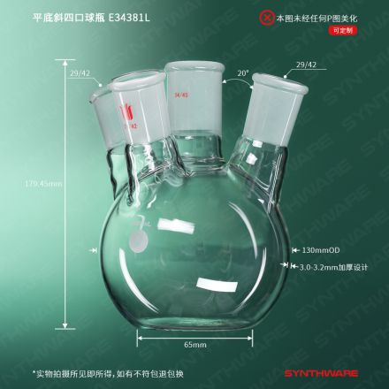 平底斜四口球瓶,中间口:34/45,侧磨口:24/40,前口:24/40,500ml E343500