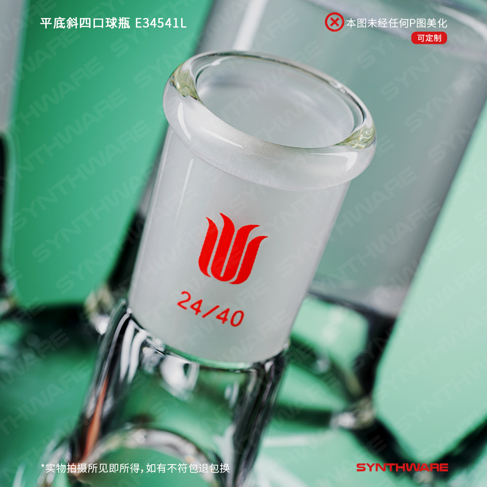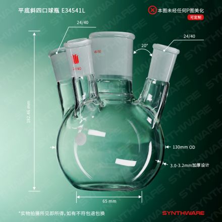 平底斜四口球瓶,中间口:24/40,侧磨口:14/20,前口:14/20,100ml E344100