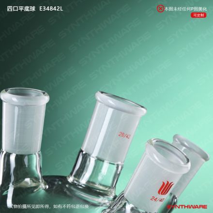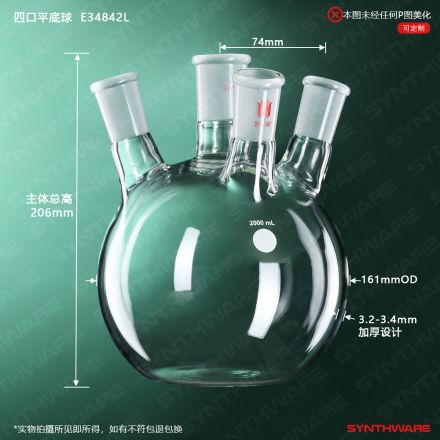 球瓶类 > 四口球瓶 > 平底斜四口球瓶 > SYNTHWARE > 平底斜四口圆底球瓶,中磨口:29/42,侧口:24/40,前口:24/40,2000ml E34842L