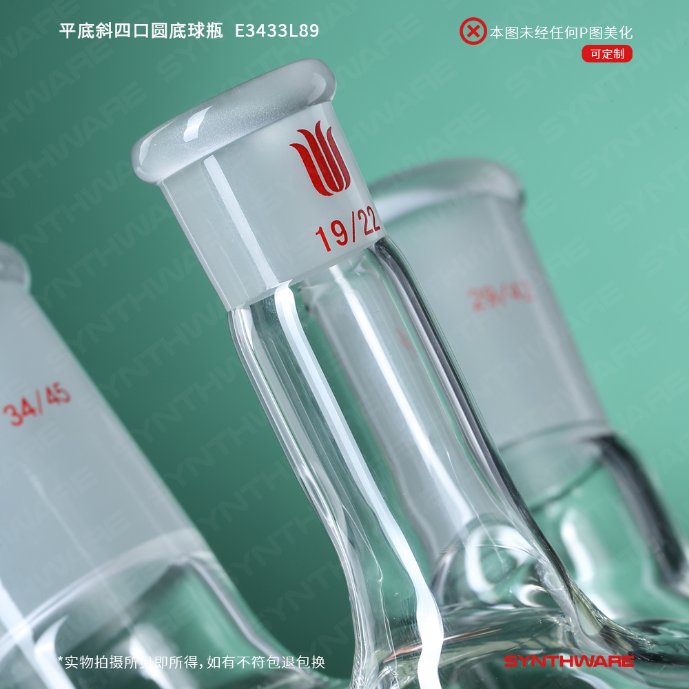 平底斜四口球瓶,中间口:24/40,侧磨口:14/20,前口:14/20,100ml E344100