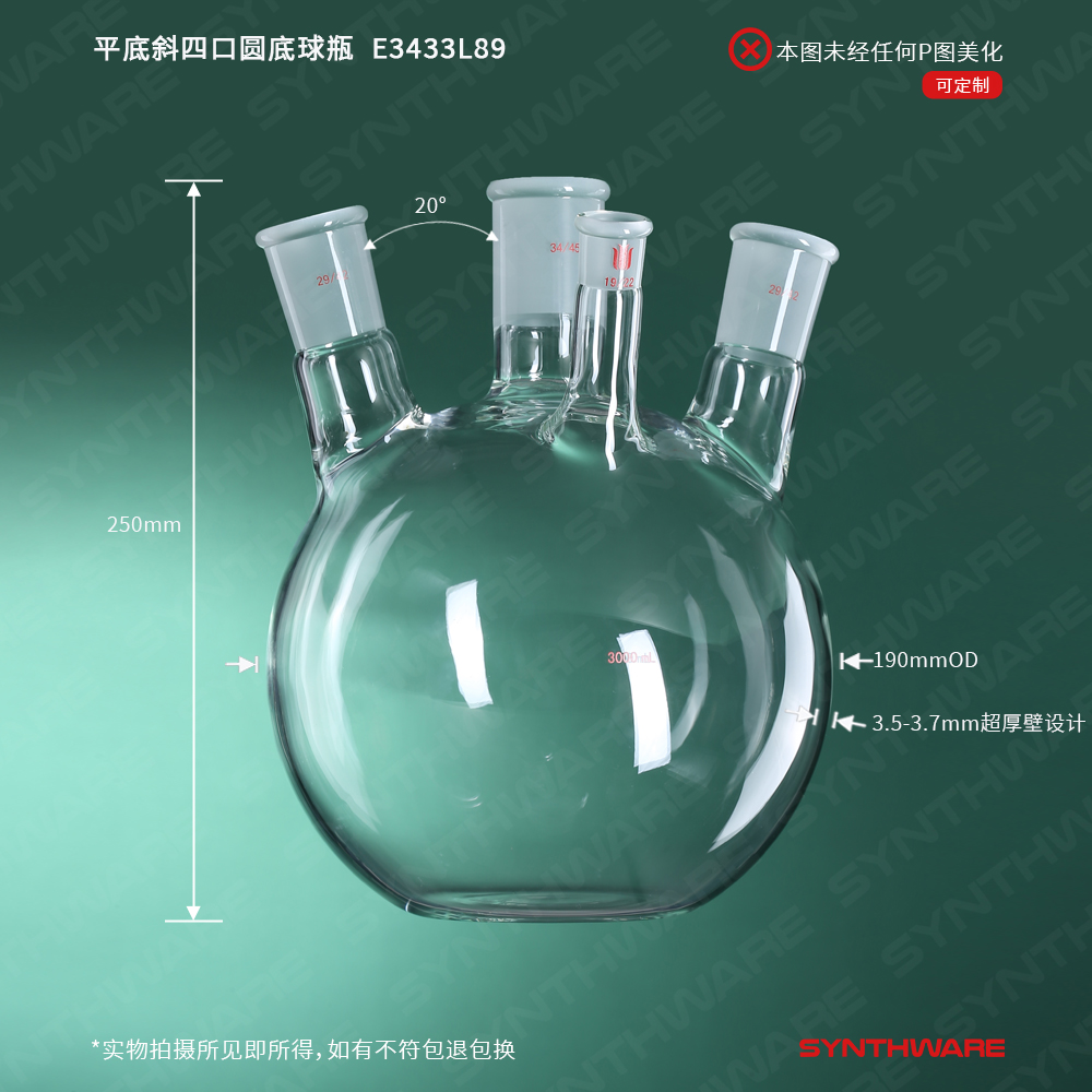 平底斜四口球瓶,中磨口:34/45,侧口:29/42,前口:14/20,3000ml E3433L81