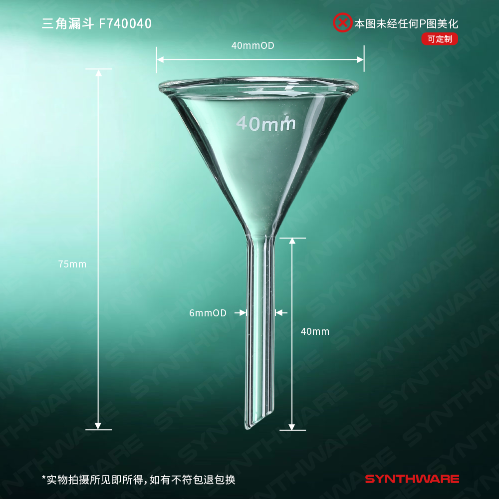 长颈三角漏斗,上口直径40mm,下管外径6mm,150mm长,磨45°斜茬 F740040L