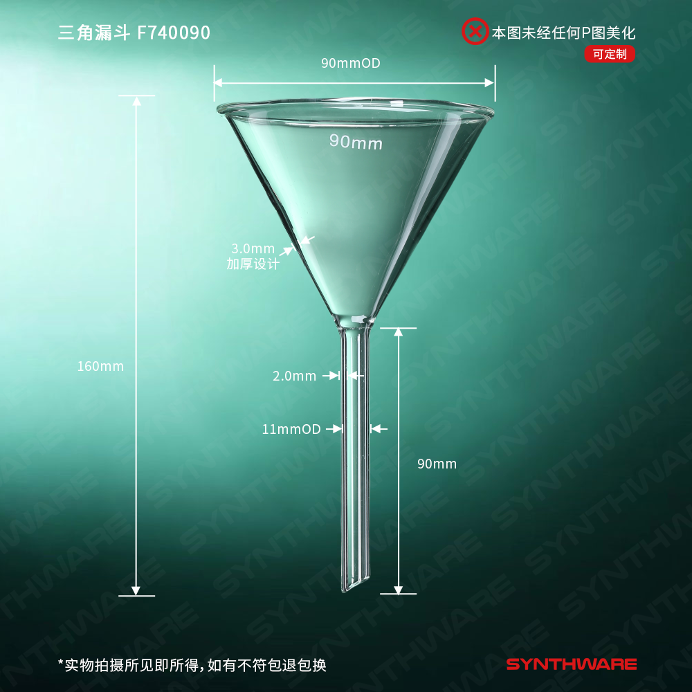 长颈三角漏斗,上口直径90mm,下管外径10mm,150mm长,磨45°斜茬 F740090L
