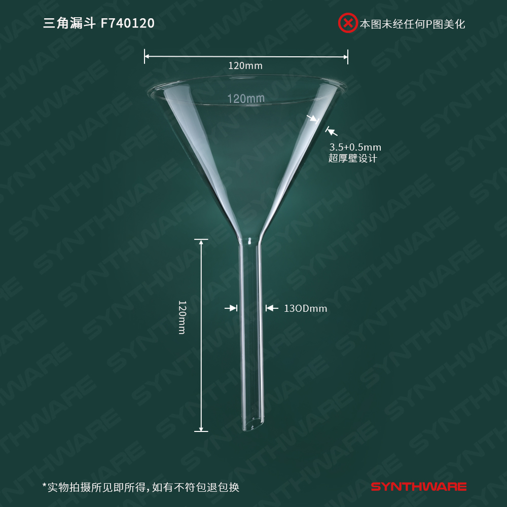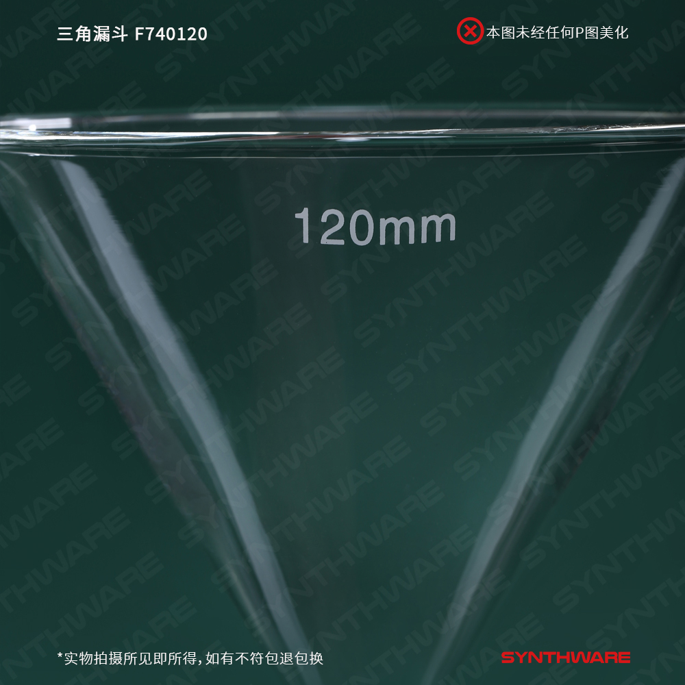 长颈三角漏斗,上口直径120mm,下管外径14mm,180mm长,磨45°斜茬 F740120L