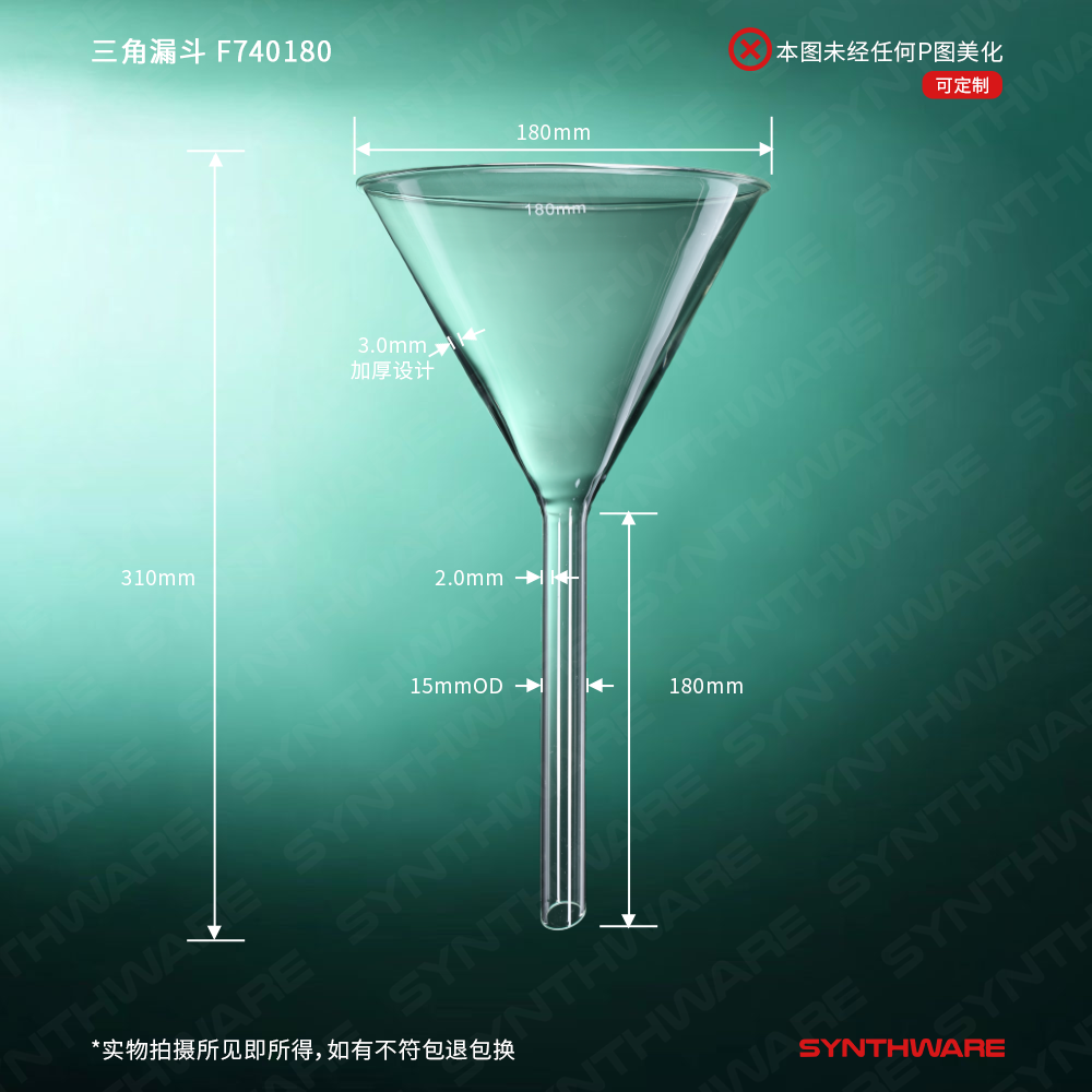 长颈三角漏斗,上口直径120mm,下管外径14mm,180mm长,磨45°斜茬 F740120L