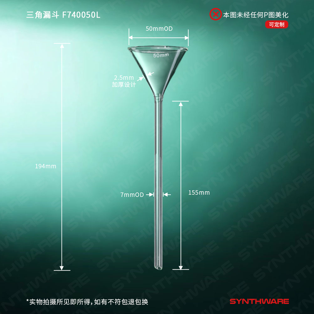 长颈三角漏斗,上口直径50mm,下管外径7mm,150mm长,磨45°斜茬 F740050L