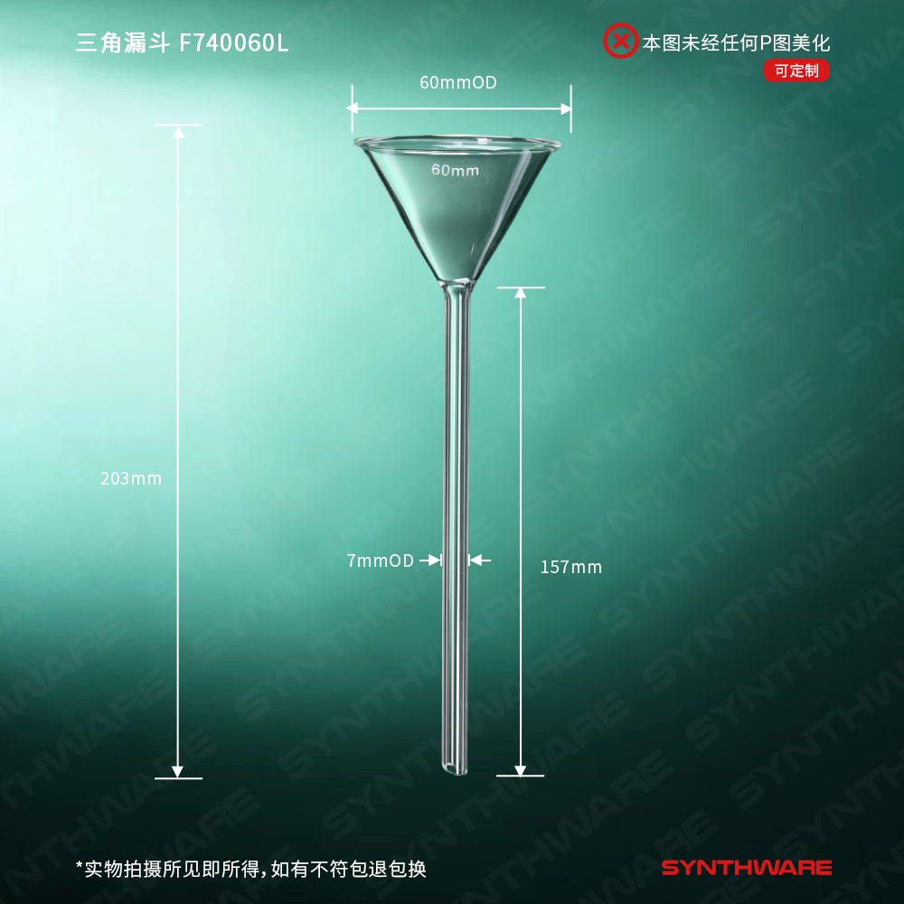 长颈三角漏斗,上口直径60mm,下管外径8mm,150mm长,磨45°斜茬 F740060L