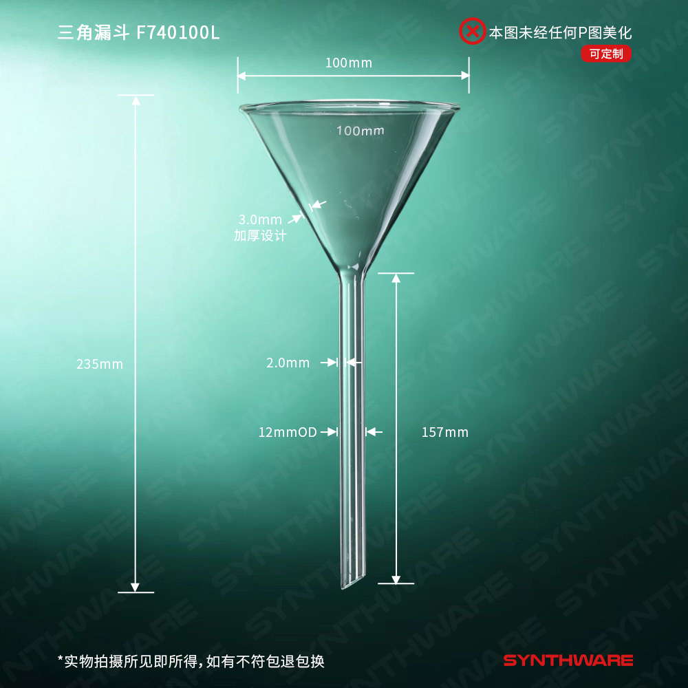 长颈三角漏斗,上口直径100mm,下管外径12mm,150mm长,磨45°斜茬 F740100L
