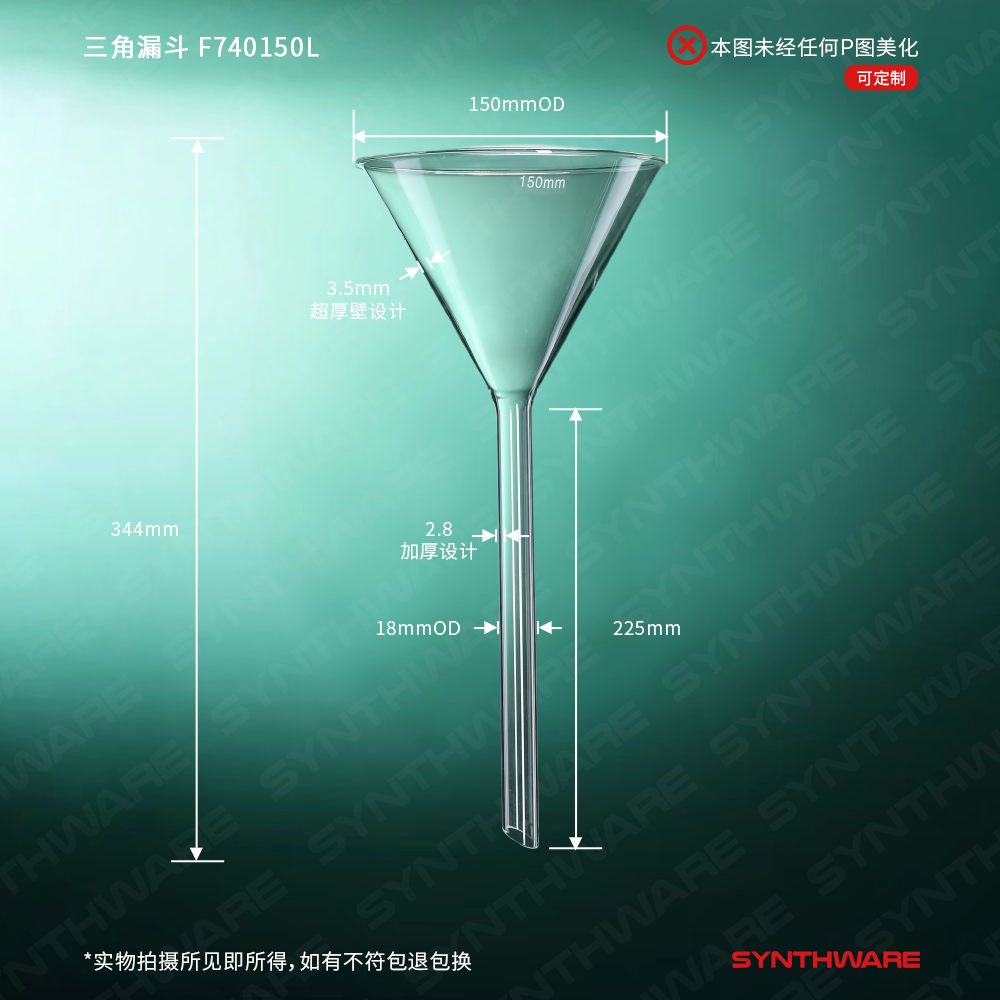 长颈三角漏斗,上口直径150mm,下管外径18mm,220mm长,磨45°斜茬 F740150L