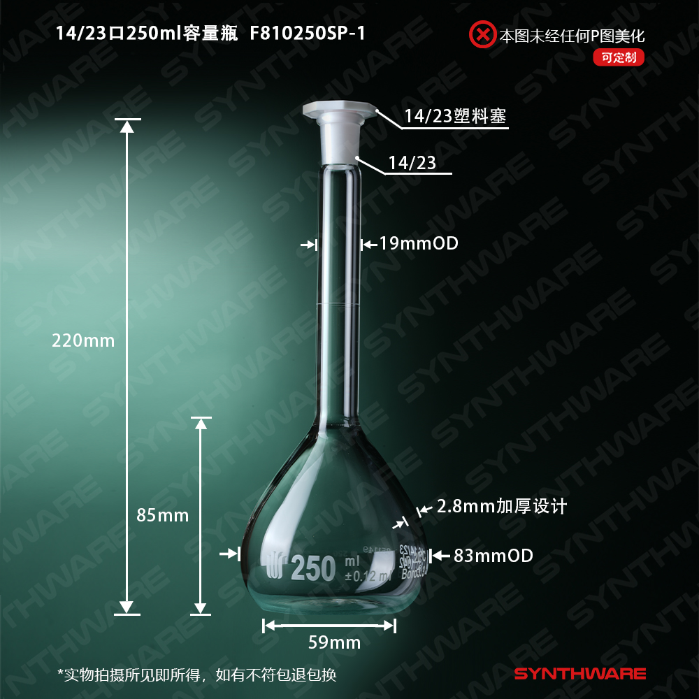 14/23口 250ml容量瓶,标配塑料塞,不带个体检测证书, F810250SP-1 F810250SP-1