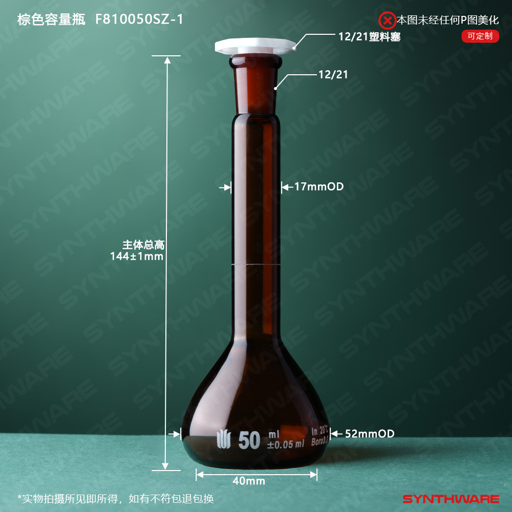12/21口 50ml棕色玻璃容量瓶,标配塑料塞,不带个体检测证书, F810050SZ-1 F810050SZ-1