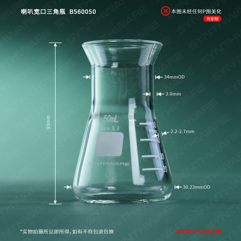 喇叭宽口三角瓶,厚壁带刻度,容量50ml,口内径:30mm B560050
