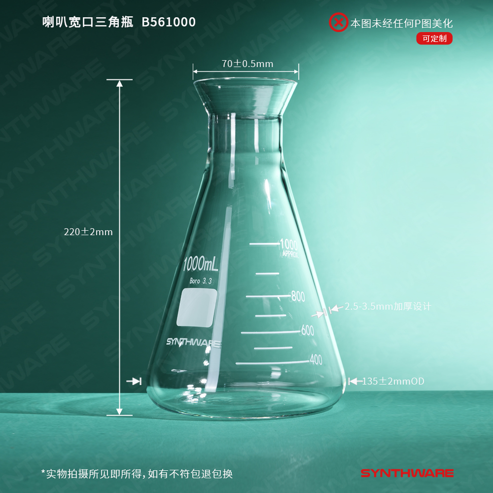 喇叭宽口三角瓶,厚壁带刻度,容量1000ml,口内径:45mm B561000