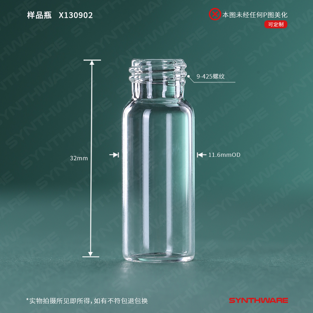 样品瓶 > 高硼硅玻璃样品瓶 > 样品瓶 > SYNTHWARE > 样品瓶,2ml,9-425螺纹口,11.6*32mm 高硼硅3.3透明玻璃,100个/盒 X130902