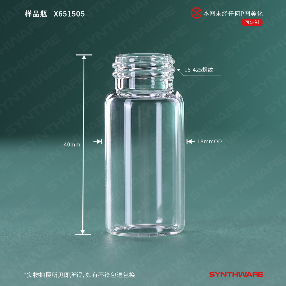 样品瓶 > 高硼硅玻璃样品瓶 > 样品瓶 > SYNTHWARE > 样品瓶,5ml,15-425螺纹口,18*40mm 高硼硅3.3透明玻璃,100个/盒 X651505