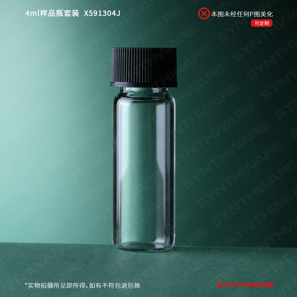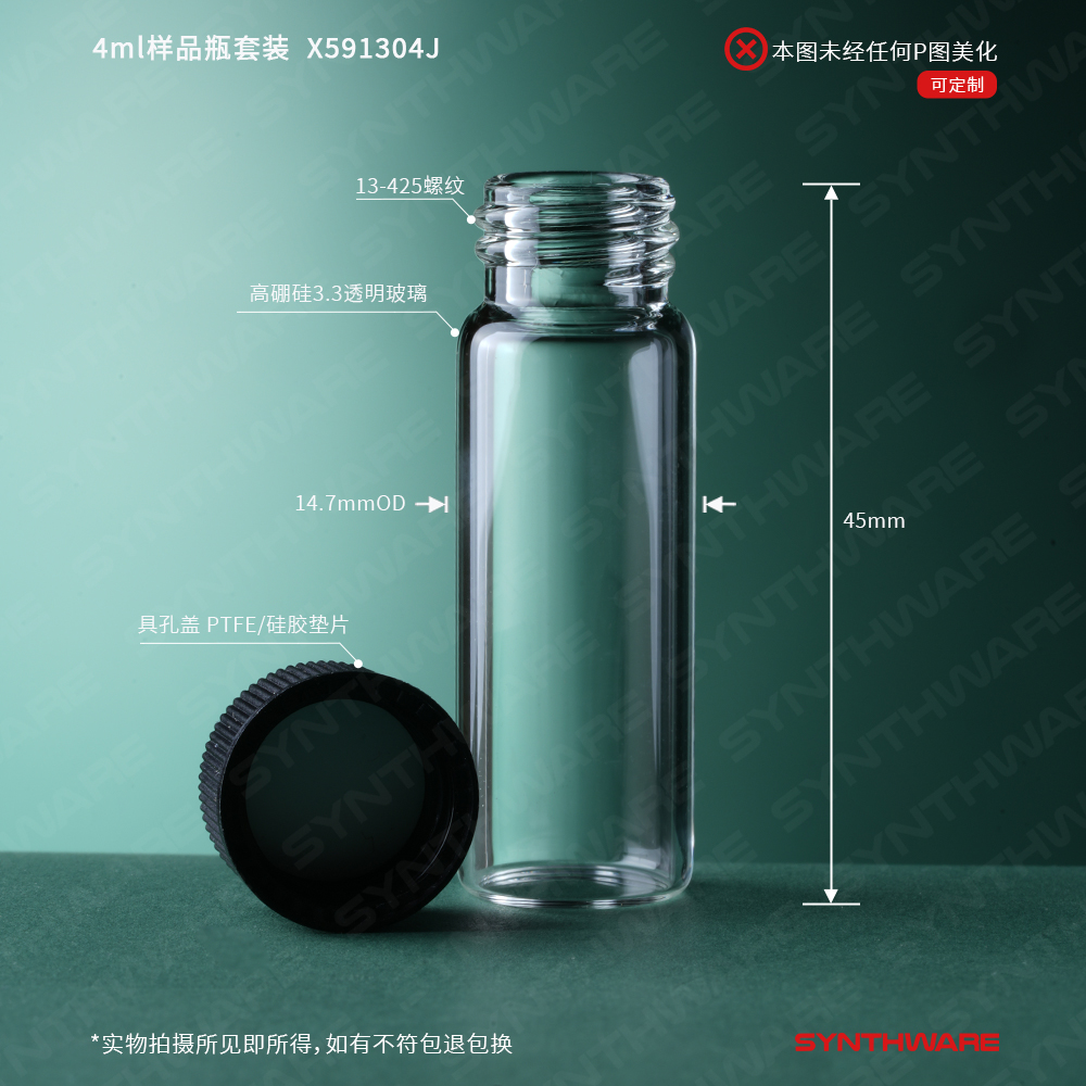 样品瓶 > 高硼硅玻璃样品瓶 > 样品瓶+盖垫套装 > SYNTHWARE > 4ml样品瓶套装,高硼硅3.3透明玻璃,13-425螺纹,14.7*45mm,具孔盖 PTFE/硅胶垫片,100/套 X591304J