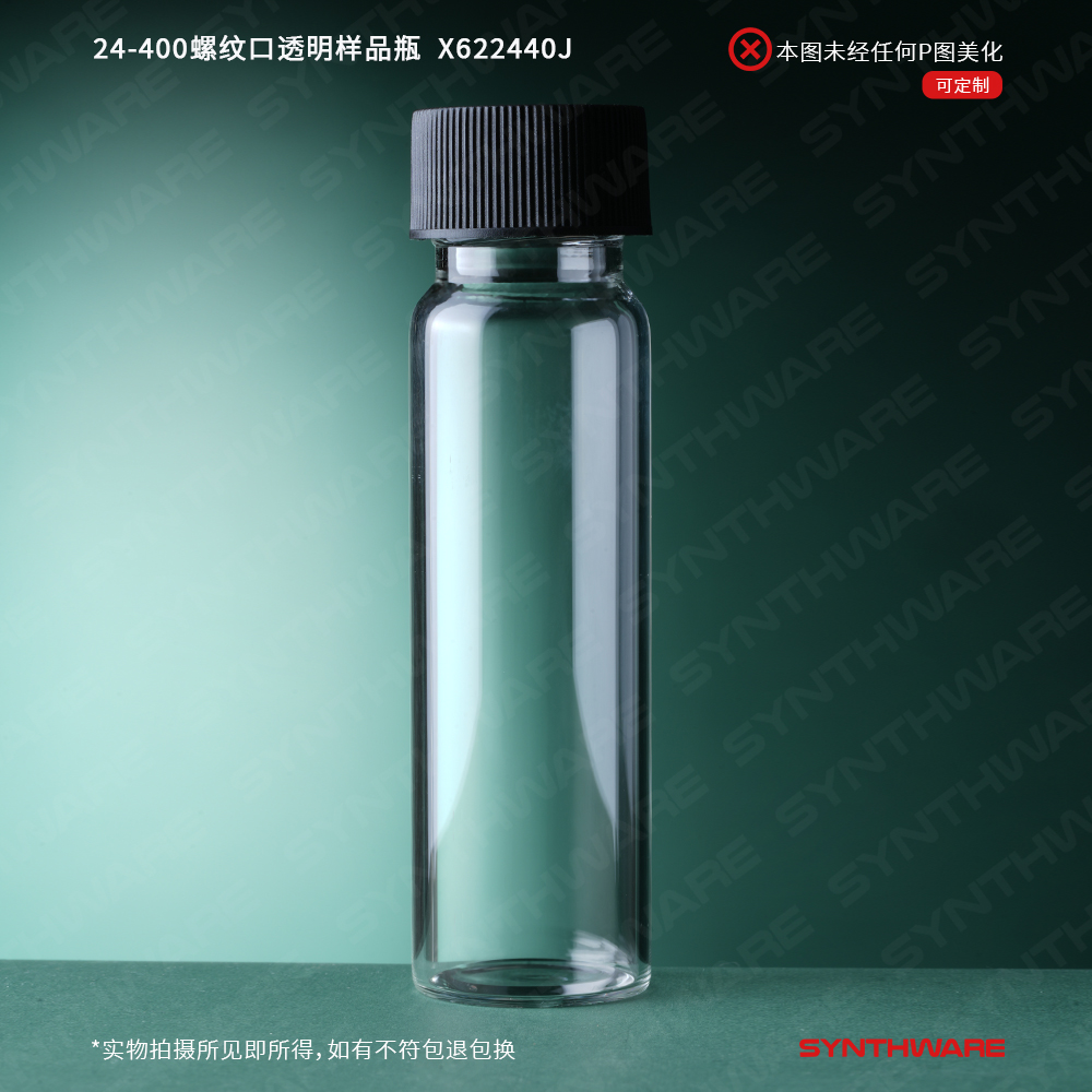 样品瓶 > 高硼硅玻璃样品瓶 > 样品瓶+盖垫套装 > SYNTHWARE > 欣维尔自制,24-400螺纹口透明样品瓶+具孔盖+垫片,40mL,27.5*95mm,100套/套 X622440J