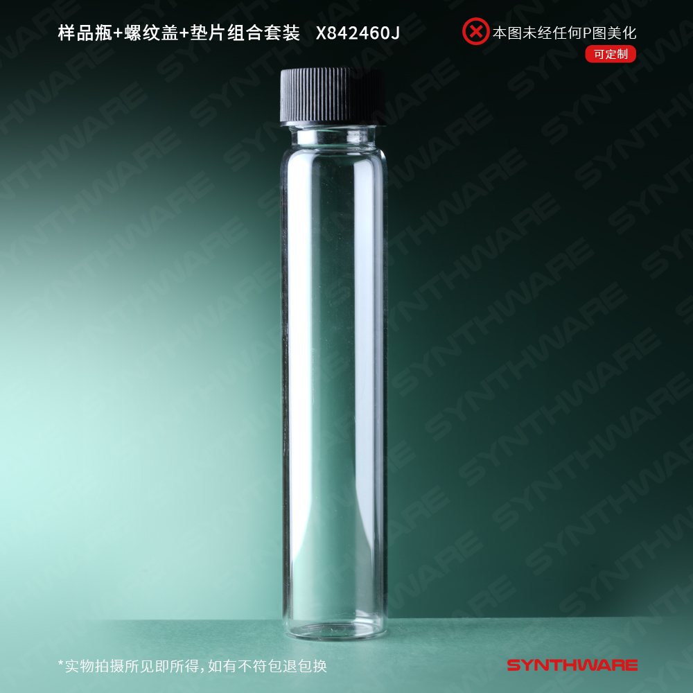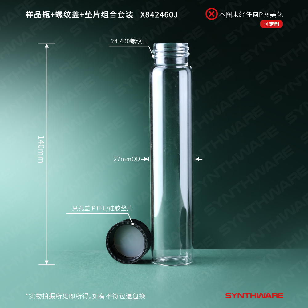 样品瓶 > 高硼硅玻璃样品瓶 > 样品瓶+盖垫套装 > SYNTHWARE > 60ml样品瓶套装,高硼硅3.3透明玻璃,24-400螺纹,27*140mm,具孔盖 PTFE/硅胶垫片,100/套 X842460J