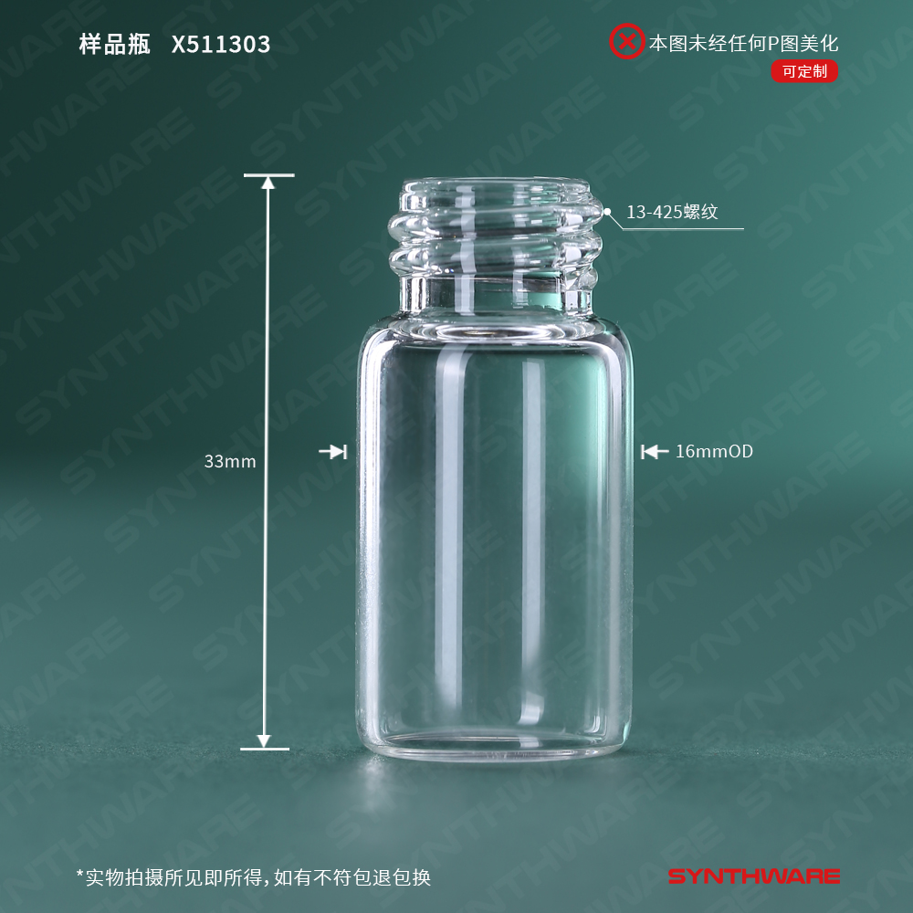 样品瓶,3ml,13-425螺纹口,16*33mm 高硼硅3.3透明玻璃,100个/盒 X511303