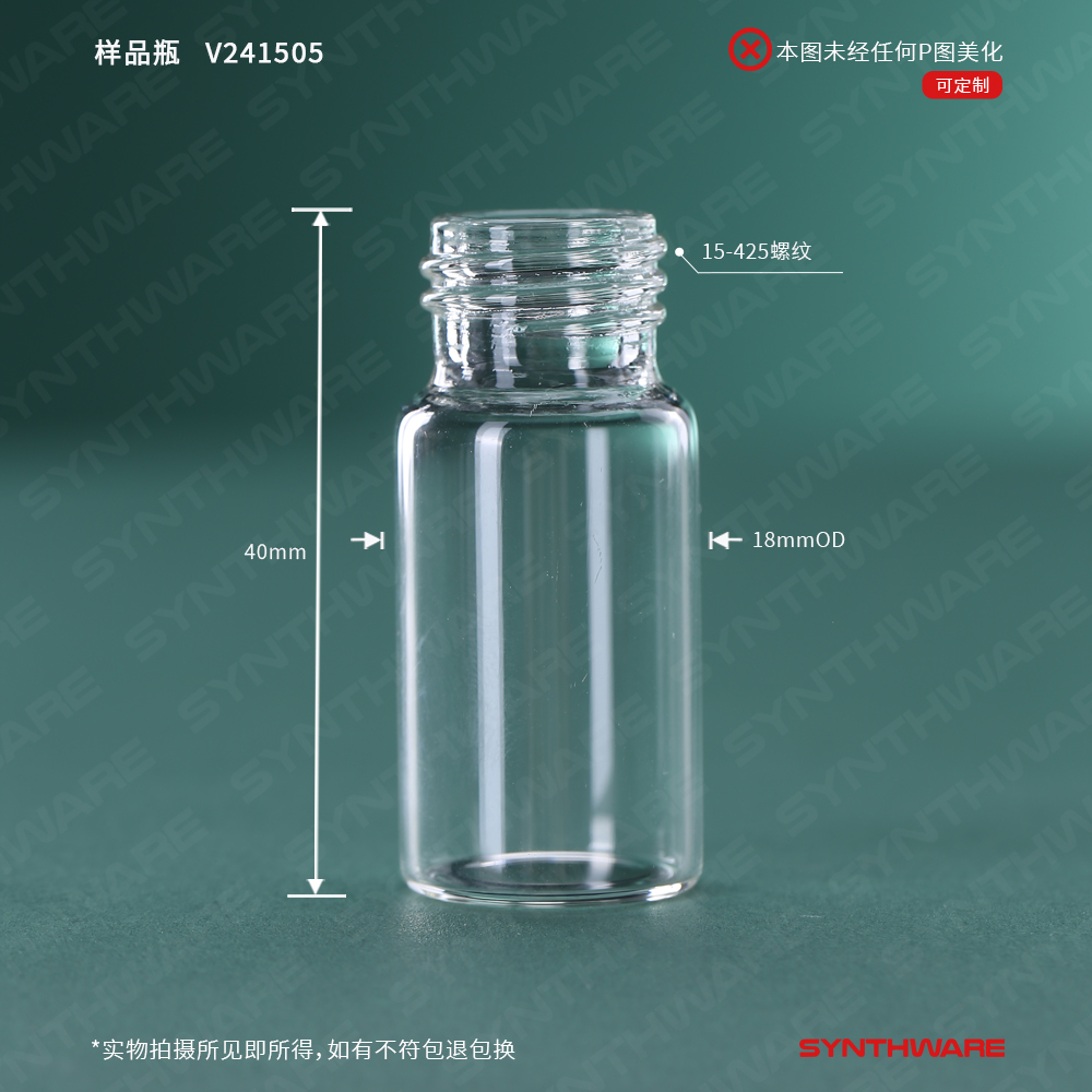 样品瓶,5ml,15-425螺纹口,18*40mm 普料透明玻璃,100个/盒 V241505