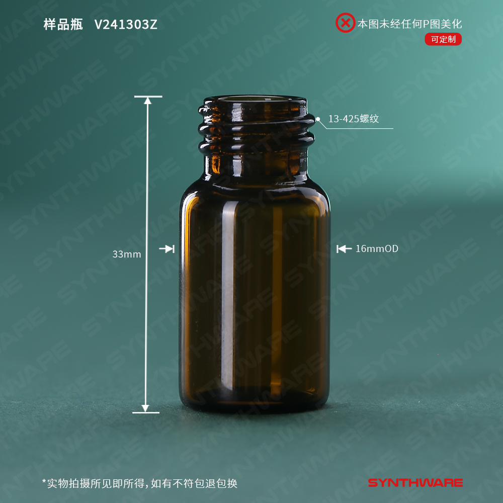 样品瓶,3ml,13-425螺纹口,16*33mm 普料棕色玻璃,100个/盒 V241303Z