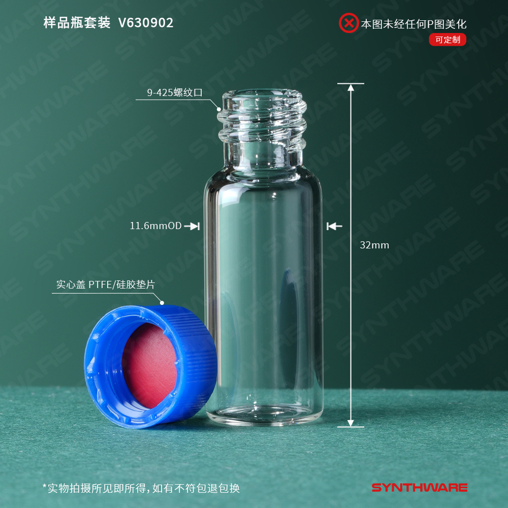 样品瓶套装,2ml,9-425螺纹口,11.6*32mm 普料透明玻璃,标配:实心盖 PTFE/硅胶垫片,10个/包 V630902-10