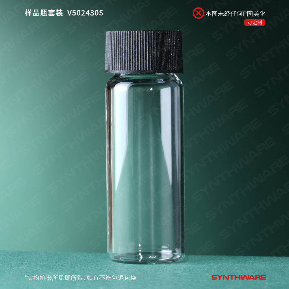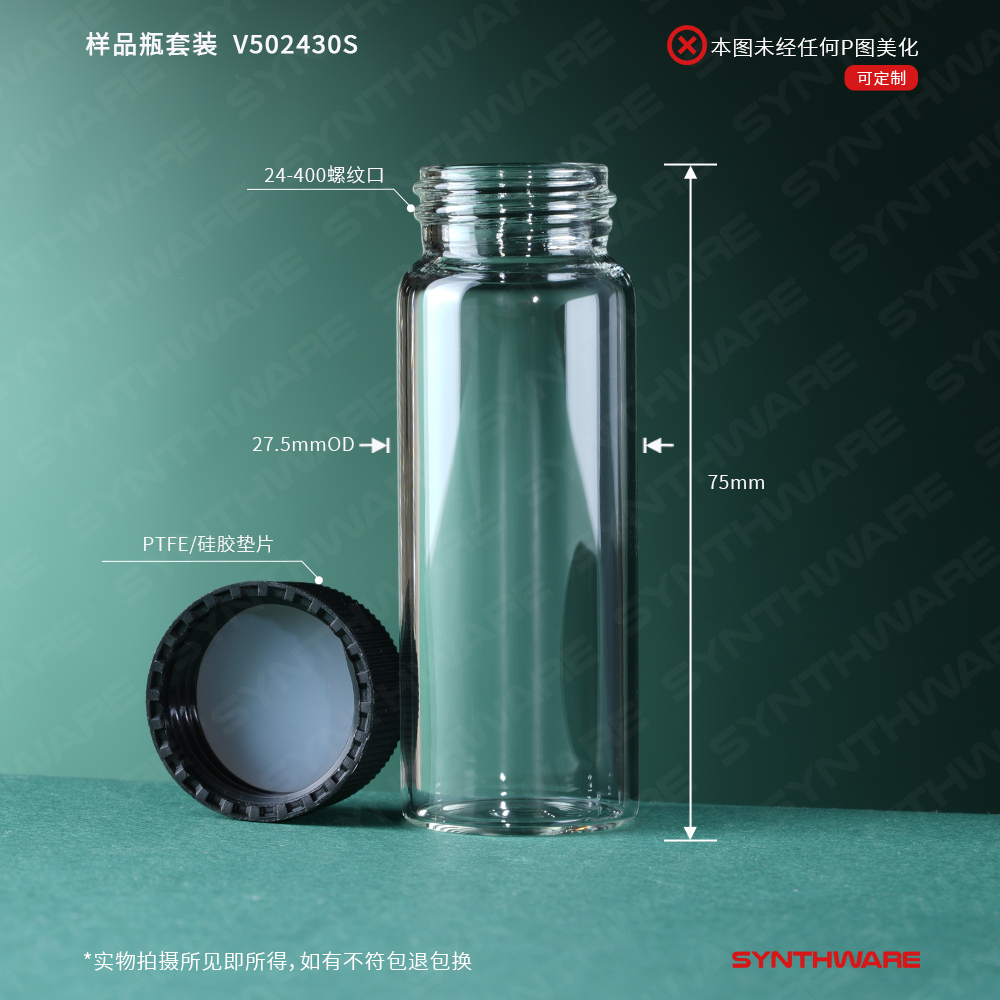 样品瓶套装30ml,24-400螺纹口27.5*75mm普料透明玻璃,标配:实心盖 PTFE/硅胶垫片10个/包 V502430S-10
