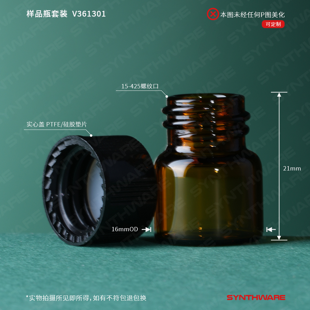 样品瓶套装,1ml,13-425螺纹口,16*21mm 普料棕色玻璃,标配:实心盖 PTFE/硅胶垫片,100套/套 V361301