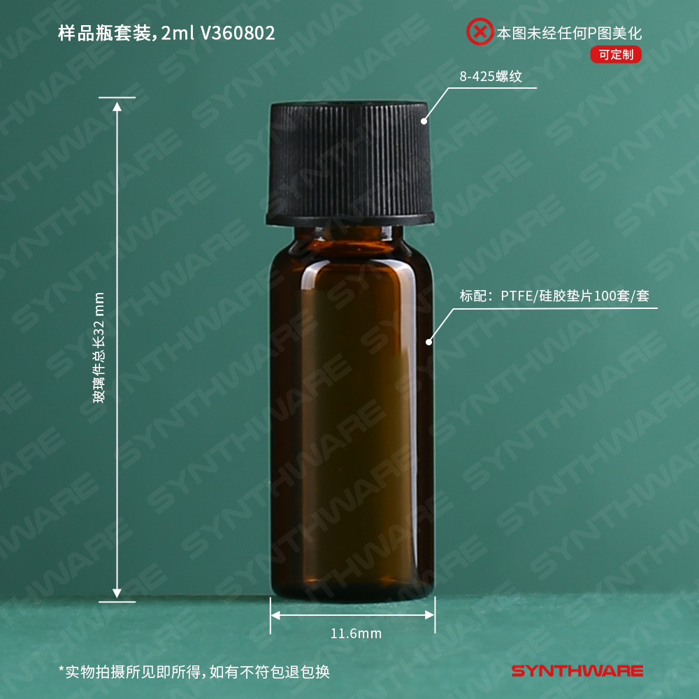 样品瓶套装,2ml,8-425螺纹口,11.6*32mm 普料棕色玻璃,标配:实心盖 PTFE/硅胶垫片,100套/套 V360802
