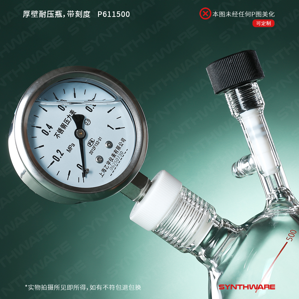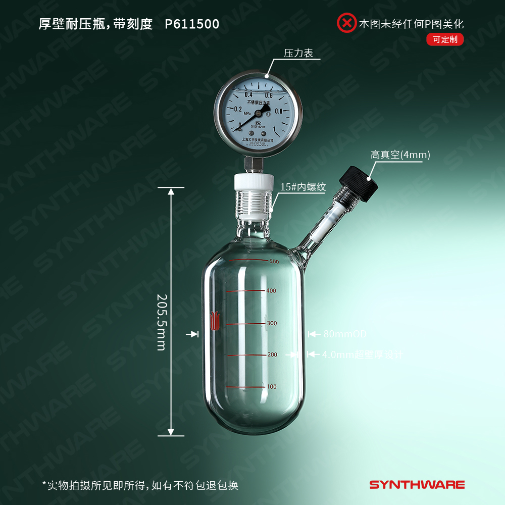 厚壁耐压瓶,带刻度,15#内螺纹口带压力表,单侧内螺纹高真空,主口15#内螺纹口,容量:500ml P611500