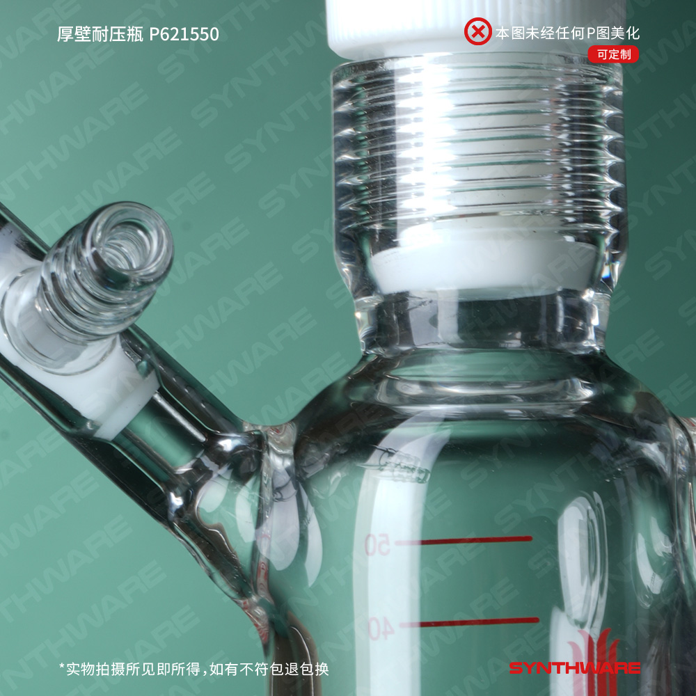 厚壁耐压瓶,带刻度,15#内螺纹口带压力表,双侧内螺纹高真空,容量:50ml P621550