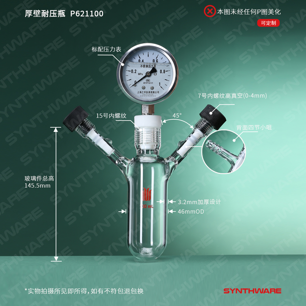 厚壁耐压瓶,带刻度,15#内螺纹口带压力表,双侧内螺纹高真空,容量:100ml P621100