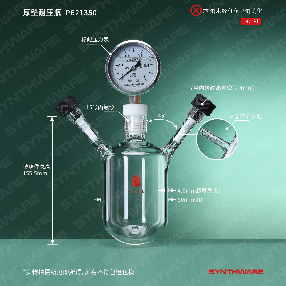 厚壁耐压瓶,带刻度,15#内螺纹口带压力表,双侧内螺纹高真空,容量:350ml P621350