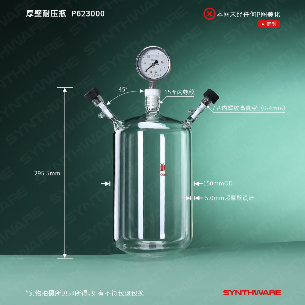 厚壁耐压瓶,带刻度,15#内螺纹口带压力表,双侧内螺纹高真空,容量:3000ml P623000