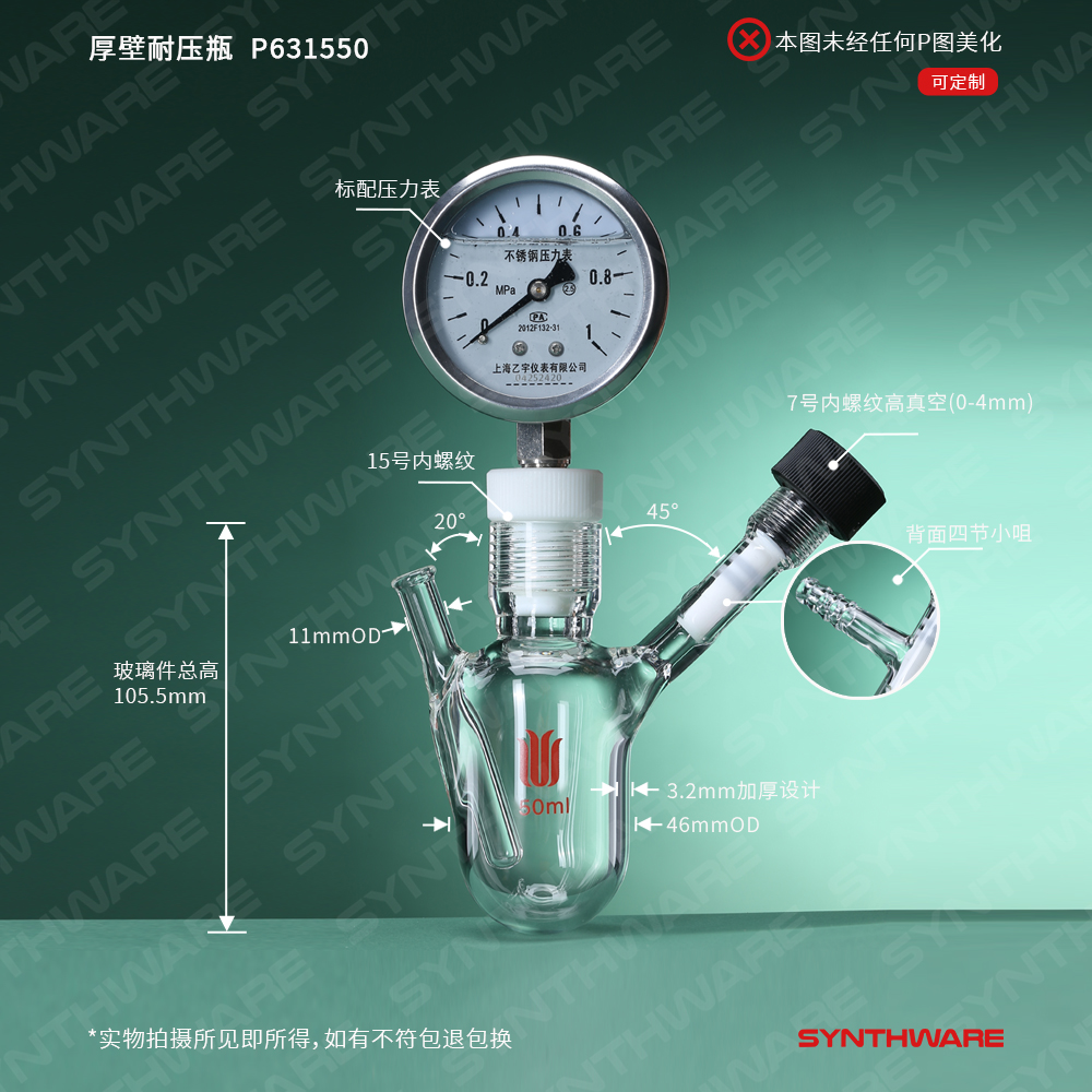 厚壁耐压瓶,带刻度,15#内螺纹口带压力表,单侧高真空阀,具温度计套管,容量:50ml P631550