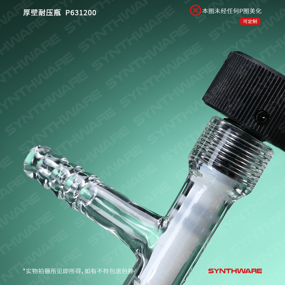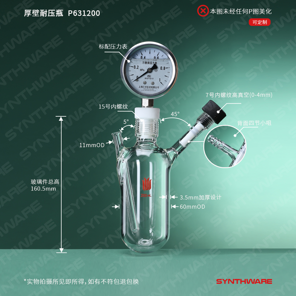 厚壁耐压瓶,带刻度,25#螺纹口带压力表,单侧内螺纹高真空,具温度计套管,容量:350ml P632350