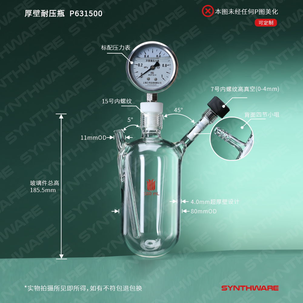 厚壁耐压瓶,带刻度,15#内螺纹口带压力表,单侧高真空阀,具温度计套管,容量:500ml P631500
