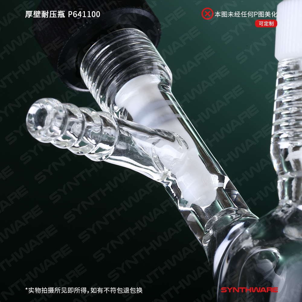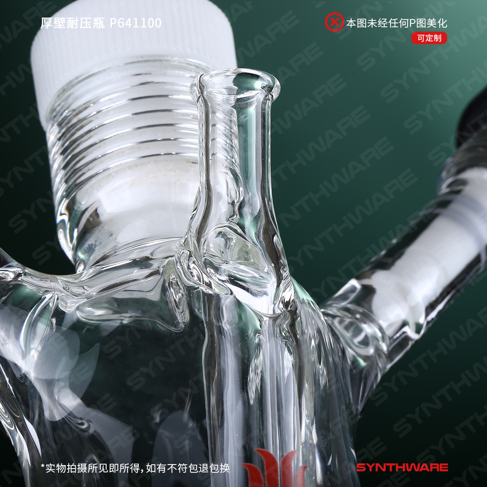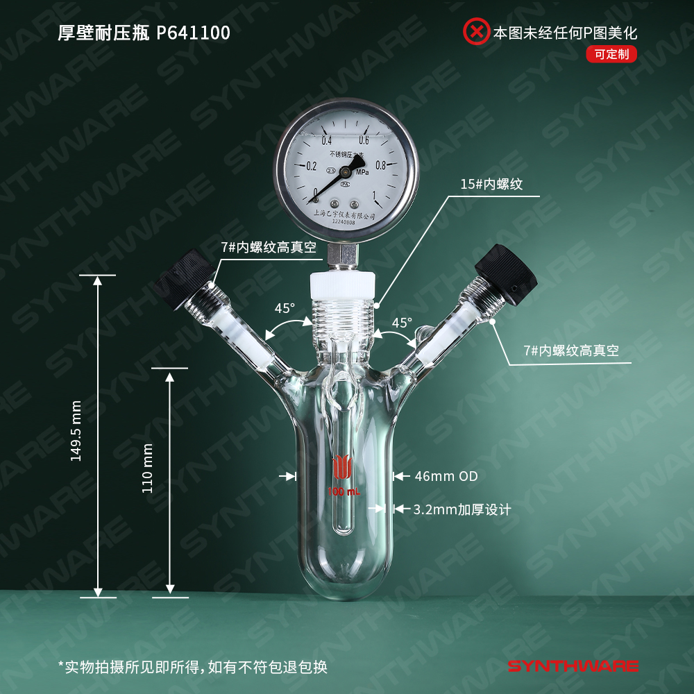 厚壁耐压瓶,带刻度,15#内螺纹口带压力表,双侧内螺纹高真空,前温度计套管,容量:100ml P641100