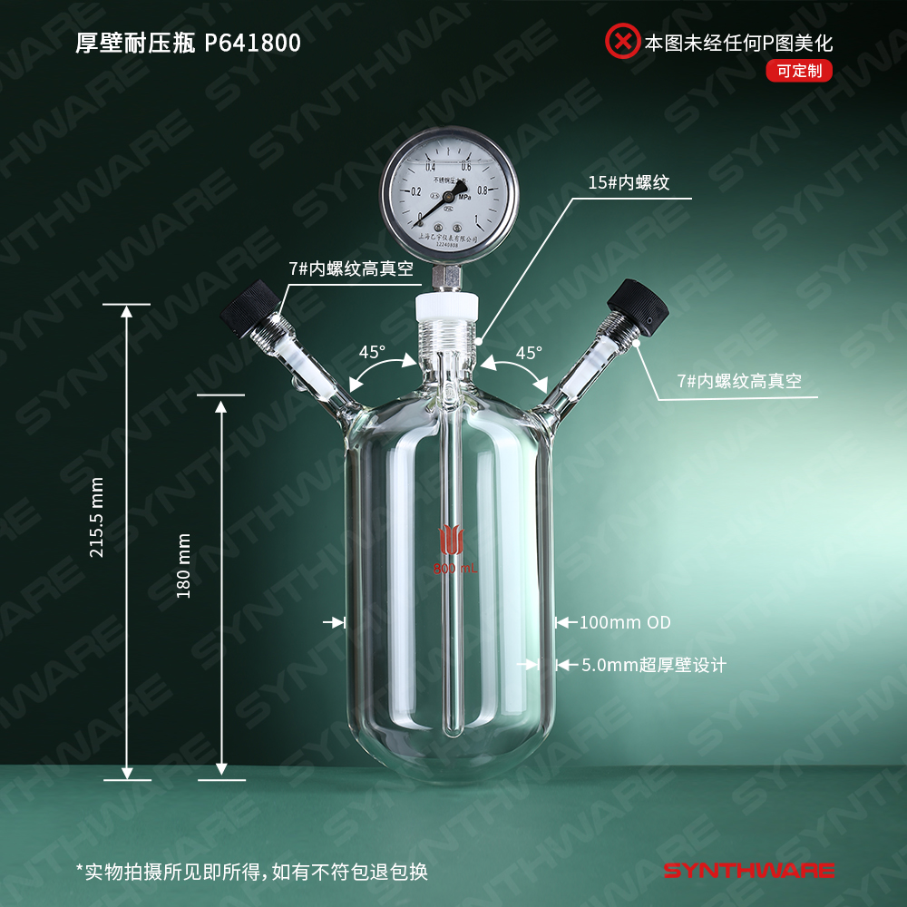 厚壁耐压瓶,带刻度,15#内螺纹口带压力表,双侧内螺纹高真空,前温度计套管,容量:100ml P641100