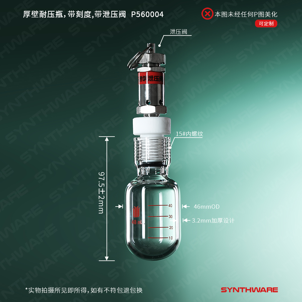 # 厚壁耐压管为内螺纹口,瓶身采用3.3高硼硅厚壁玻璃管制得,标配四氟螺纹盖(含四氟密封环)和0.6 MPa泄压阀。